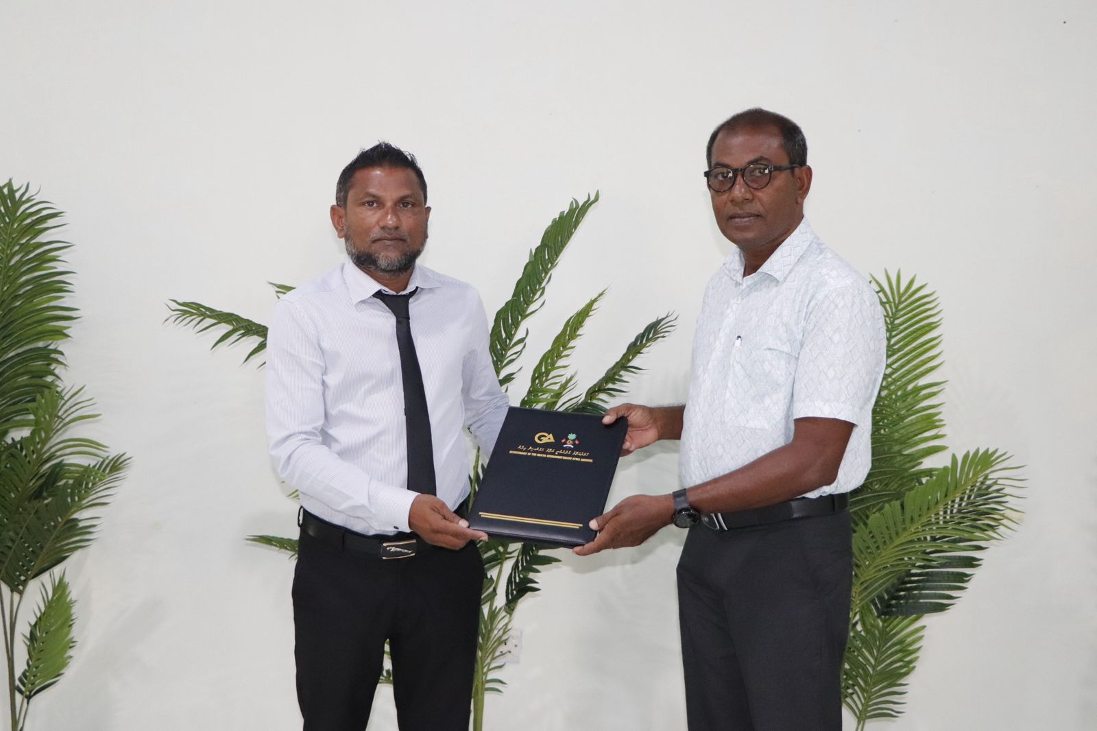 ގއ. ސްޓޭޓްހައުސްގެ ގްރައުންޑް ފްލޯރ މަރާމާތު ކުރުމުގެ މަސައްކަތް ކޮށްދޭނެ ފަރާތެއް ހޯދުމަށް ކުރެވުނު އިއުލާނާއި ގުޅިގެން ހުށަހެޅުނު ބިޑްތައް އިވެލުއޭޓްކޮށް މިމަސައްކަތް ހަވާލުކުރުމަށް ބިޑްކޮމިޓީން ނިންމެވި ގޮތުގެމަތިން ބިންގަލާ އާއި ހަވާލުކުރުމުގެ އެއްބަސްވުމުގައި 09 ފެބްރުއަރީ 2025 ގައި ސޮއިކޮށްފި . 578134.00 ރުފިޔާ އަށް 35 ދުވަހުގެ މުއްދަތުގައި ނިންމުމަށް ސޮއިކުރެވުނު މިއެއްބަސްވުމުގައި އަތޮޅުކައުންސިލްގެ ފަރާތުން ސޮއިކުރެއްވީ އަތޮޅުކައުންސިލްގެ ރައީސް އަލްފާޟިލް އިބްރާހީމް ޝަހީން. ބިންގަލާ އިން ސޮއިކުރެއްވީ މެނެޖިންގ ޑިރެކްޓަރ އަލްފާޟިލް މުޙައްމަދު ނަޞީރު އަލީ . އަތޮޅުކައުންސިލްގެ ޓްރެއިނިންގ ހޯލުގައި ބޭއްވުނު ސޮއިކުރުމުގެ މިރަސްމިއްޔާތުގައި އަތޮޅުކައުންސިލްގެ ބައެއް އިސްވެރިން ބައިވެރިވެ ވަޑައިގެންނެވި.